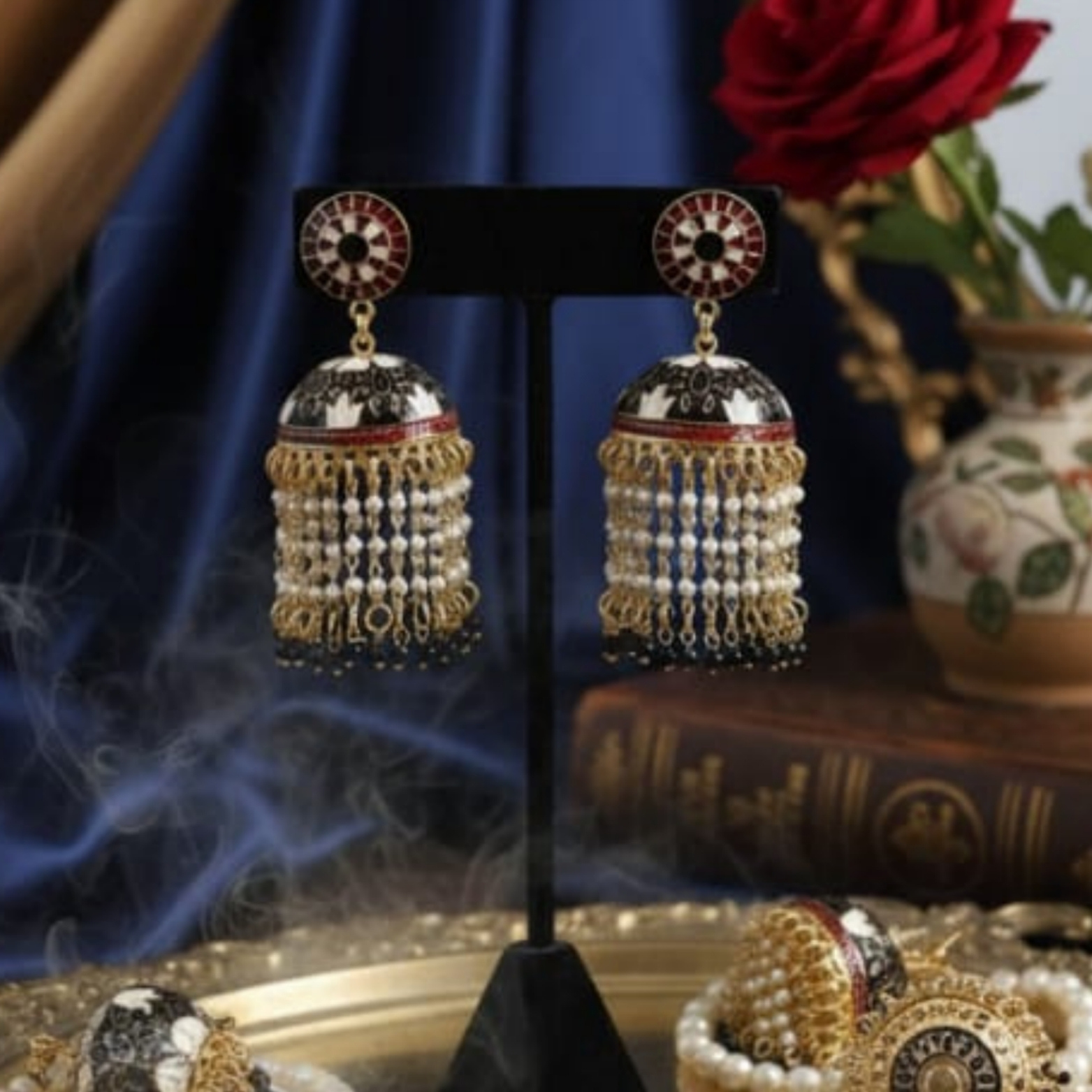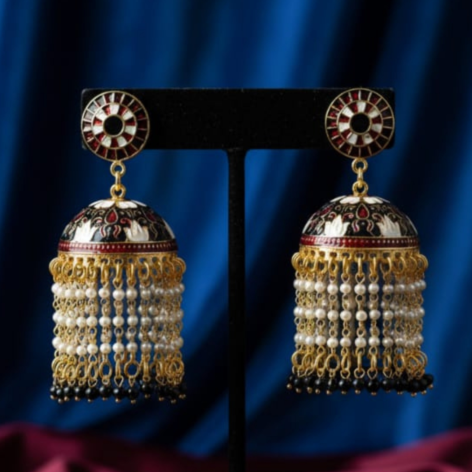Each piece is intricately handcrafted — featuring a bold dome design with exquisite black, ivory, and maroon enamel work, highlighted by fine detailing in antique gold. The lower half cascades into delicate strings of mini pearls and golden loops, ending with tiny black beads that sway gracefully with every movement.